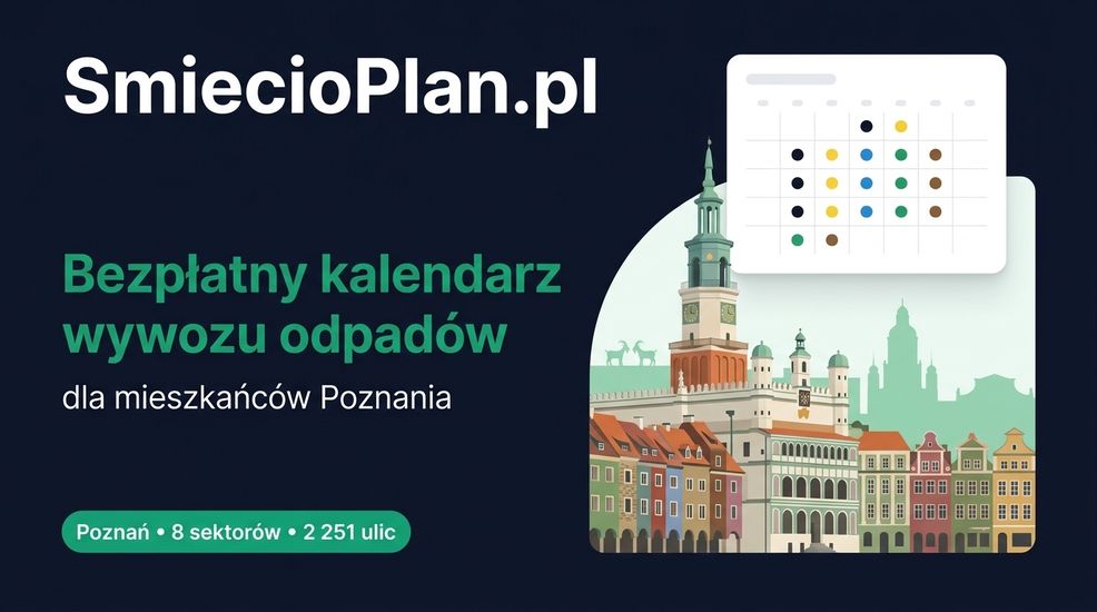 Mieszkańcy Poznania mogą sprawdzić roczny harmonogram wywozu odpadów dla swojego adresu, korzystając z bezpłatnej platformy SmiecioPlan.pl. Wystarczy wpisać nazwę ulicy i numer domu, a w zaledwie 10 sekund użytkownik otrzymuje przejrzysty kalendarz odbioru wszystkich frakcji: odpadów zmieszanych, papieru, plastiku, szkła, bioodpadów, wielkogabarytów oraz choinek. Serwis obejmuje wszystkie 42 osiedla samorządowe stolicy Wielkopolski oraz 8 sektorów odbioru. Działa w przeglądarce internetowej, nie wymaga instalacji aplikacji, logowania ani nie wyświetla reklam.