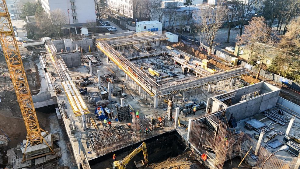 - Dziś już prace dotyczące fundamentów, ścian i stropu piwnic mamy za sobą. Aktualnie wykonawca koncentruje się na budowie naziemnych kondygnacji. Trwają prace zbrojarskie i murarskie, ściany zewnętrzne pną się do góry. W środku, oprócz głównej hali basenowej, będzie też np. sala do rehabilitacji i pomieszczenia dla obsługi – mówi Tomasz Płóciniczak, wiceprezes spółki Poznańskie Inwestycje Miejskie.
