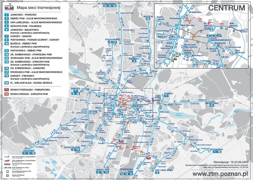 Spowoduje to brak możliwości kursowania tramwajów od mostu Teatralnego przez Fredry, Mielżyńskiego i pl. Ratajskiego do pl. Wielkopolskiego oraz przez Św. Marcin (od Gwarnej do Marcinkowskiego). Od 19 do 22 czerwca do centrum będzie można dojechać tramwajem do przystanku pl. Wielkopolski (od strony Garbar) wahadłową linią numer 98 (z ronda Śródka do pl. Wielkopolskiego) oraz tramwajami linii numer 2, 3, 13 i 17 do przystanku Marcinkowskiego. Od strony Jeżyc najbliższym przystankiem tramwajowym przy centrum będzie Uniwersytet Ekonomiczny na ulicy Towarowej. W celu wzmocnienia komunikacji przez Wartę wzdłuż ulic Estkowskiego i Wyszyńskiego, oprócz linii wahadłowej nr 98 będzie do dyspozycji wydłużona do ronda Śródka linia autobusowa nr 163.