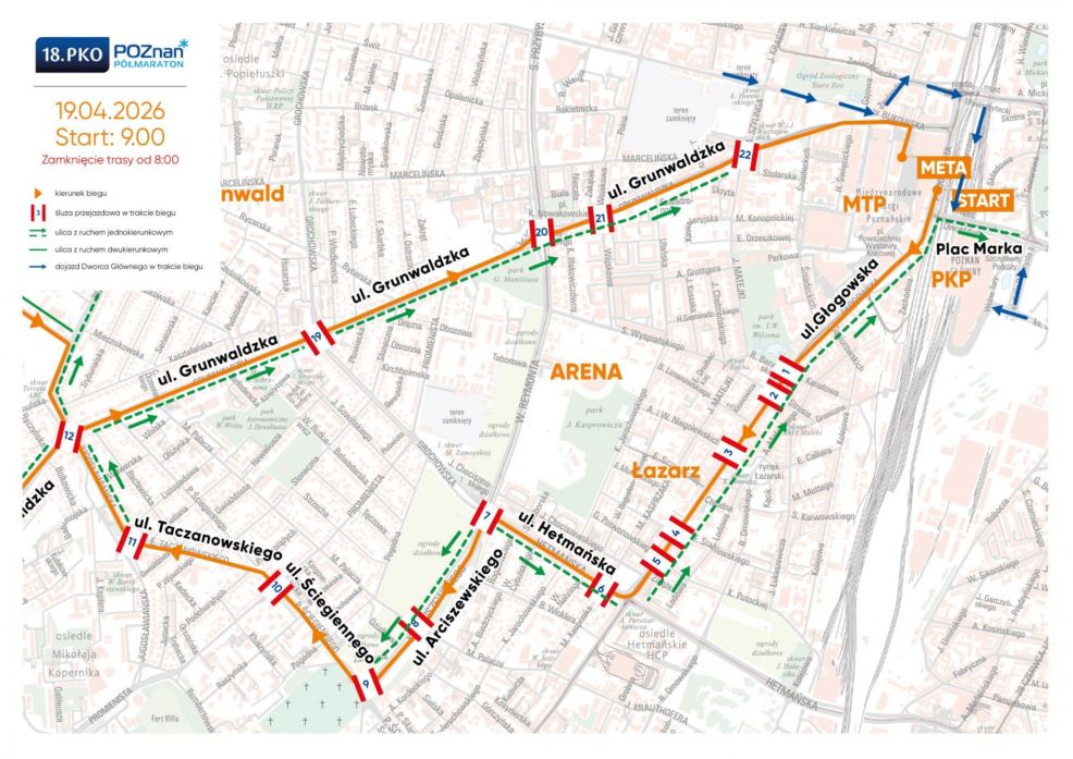 w niedzielę 19.04.2026 r. odbędzie się 18. PKO Poznań Półmaraton i w związku z jego przebiegiem nastąpią zmiany w organizacji ruchu i komunikacji miejskiej. Trasa biegu zostanie zamknięta dla ruchu kołowego w godzinach od 8:00 do 13:30.