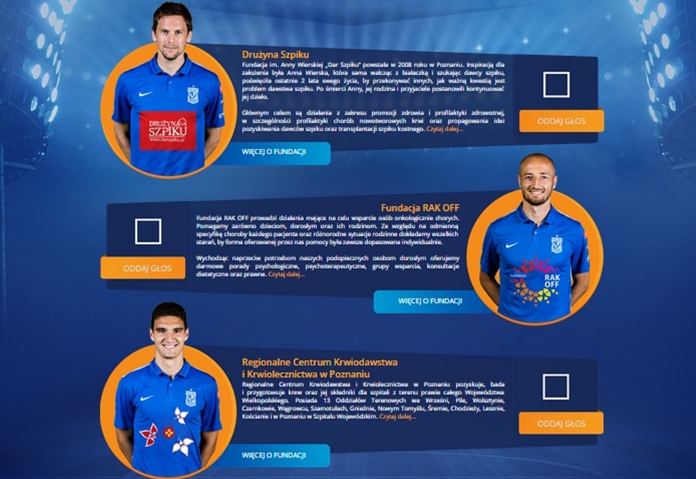 Do wyboru są trzy logotypy, Fundacji RAK OFF, Regionalnego Centrum Krwiodawstwa i Krwiolecznictwa w Poznaniu lub Drużyny Szpiku. Ta pierwsza prowadzi działania mające na celu wsparcie osób onkologicznie chorych, refunduje koszty leczenia czy zapewnia środki czystości. Drużyna Szpiku to grupa wolontariuszy działających bezinteresownie na rzecz osób chorych na nowotwory krwi w szczególności na białaczki. Centrum Krwiodawstwa nie trzeba przedstawiać, zajmuje się badaniem i przygotowaniem krwi oraz jej składników dla szpitali z terenu prawie całego województwa wielkopolskiego